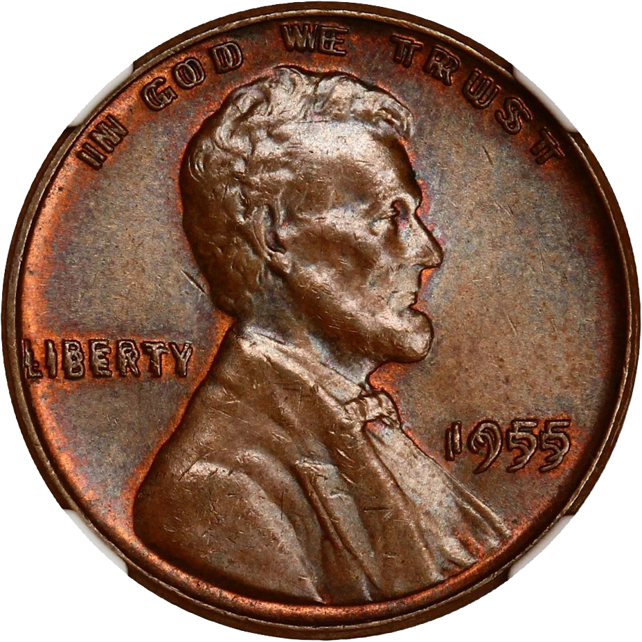 The 1955 doubled die Lincoln cent is perhaps the most well-known variety error in all of numismatics. This is partly due to its minting and discovery happening most serendipitously during a period when coin collecting was enjoying a boom in popularity during the post-war years of the 1950s. Many examples turned up in 23-cent packs of cigarettes containing two one-cent coins as change via vending machines that accepted only quarters. These coins were found mainly in New England, though they popped up elsewhere as well. Numismatic legend has it that mint employees were aware that several thousand 1955 doubled die cents had been made by accident but opted to let them go instead of recalling and destroying a batch of Lincoln cents numbering into the tens of thousands. Doubling is easily seen with the naked eye in the date, inscription LIBERTY and motto IN GOD WE TRUST.